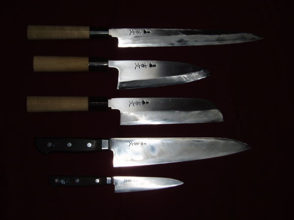 上から柳刃包丁・出刃包丁・鎌型薄刃包丁・牛刀・ペティナイフ